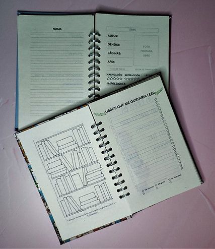 ♡ Pasta dura ♡ 80 Hojas ♡ Argollado ♡ Tamaño Media Carta ♡ Sección de metas (libros a leer), indice de libros, frases, reto literario y 60 hojas para colocar opiniones sobre el libro leido.