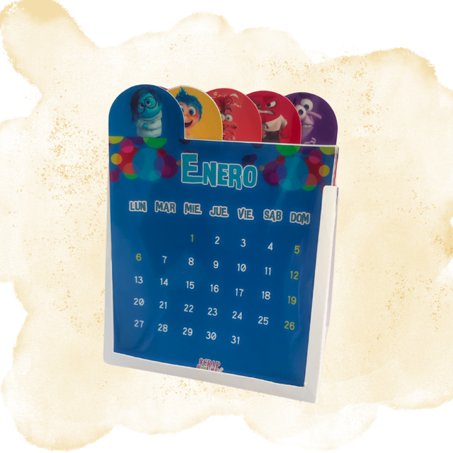 Calendario con soporte resistente para exhibir mes a mes. Cada página muestra adorables imágenes de gatitos o personajes de Intensamente, fácil de girar para descubrir el próximo mes